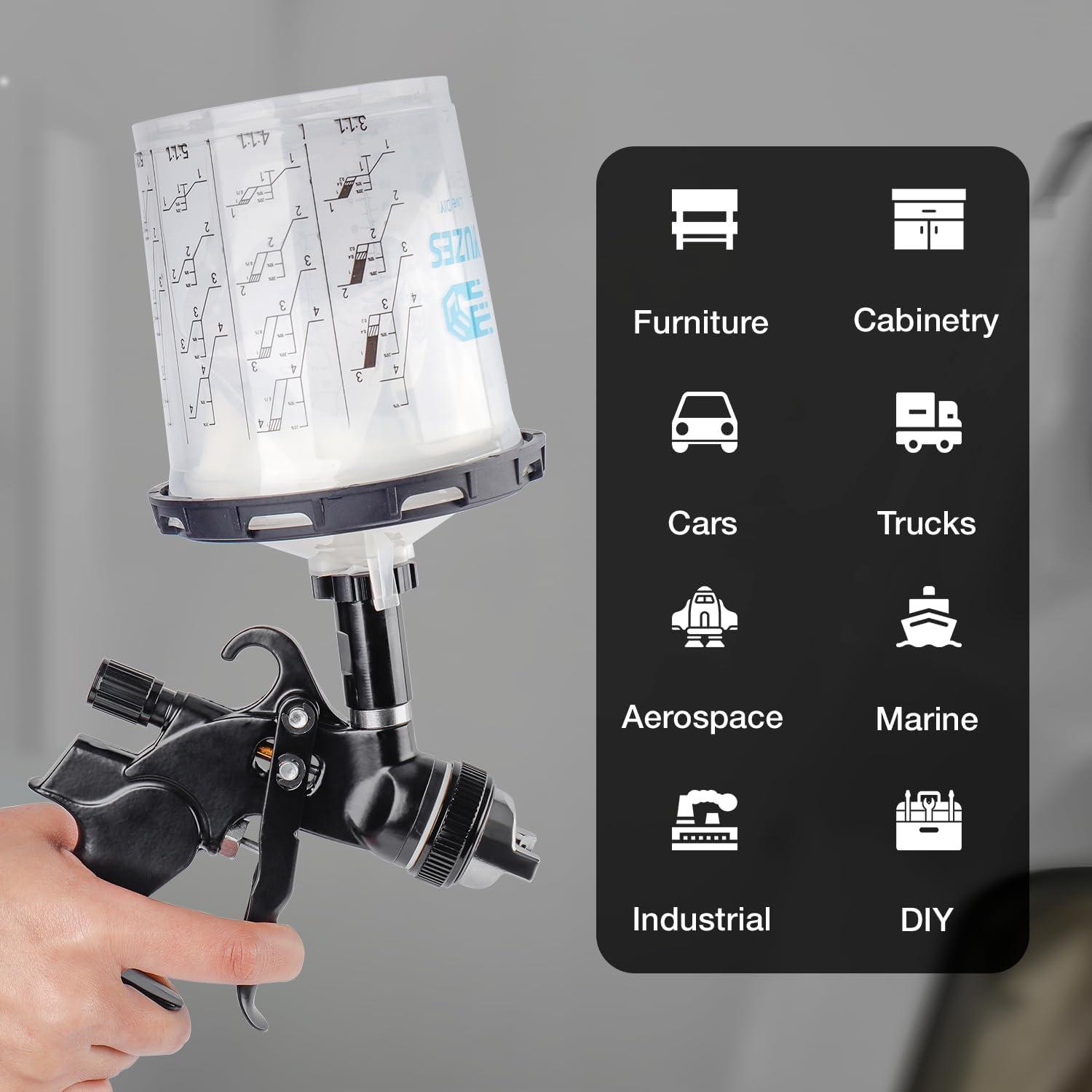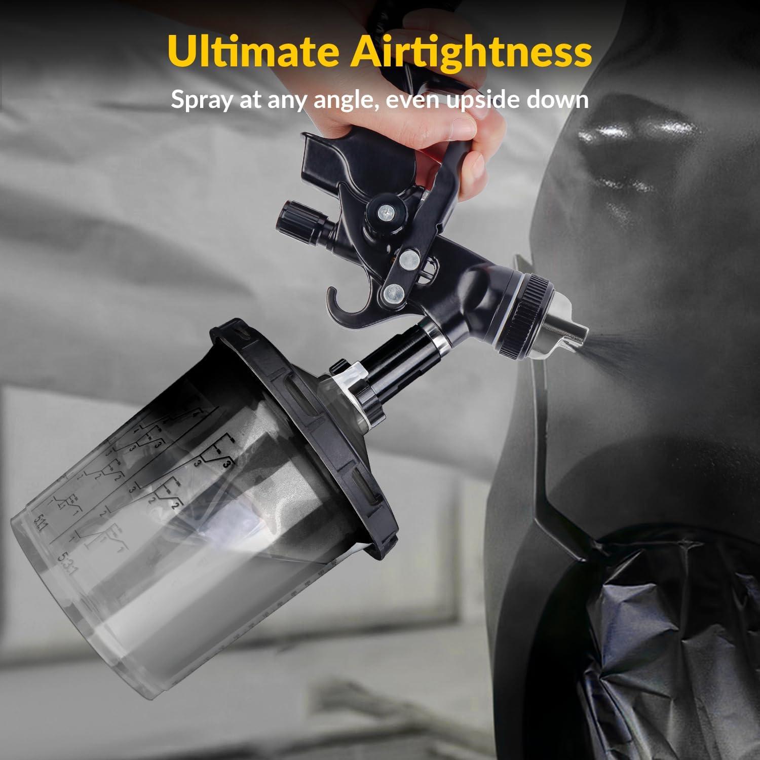 360° Spray At Any Angle: The excellent sealing of the paint cups with the lid system 20 ounce allows you to spray at any angle, even upside down, ensuring that every drop is used without waste. Ideal for spraying automotive, boats, aerospace, furniture, home, and crafts
