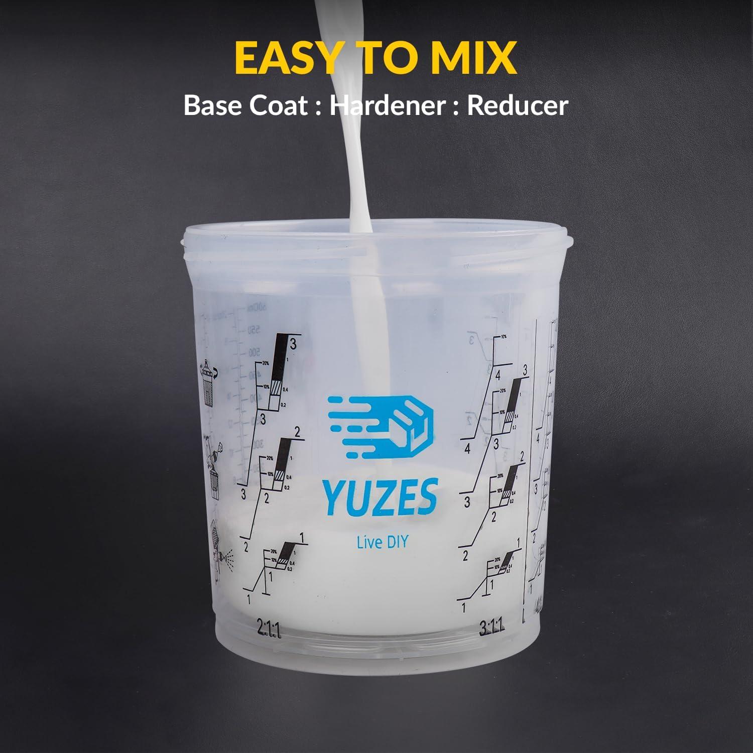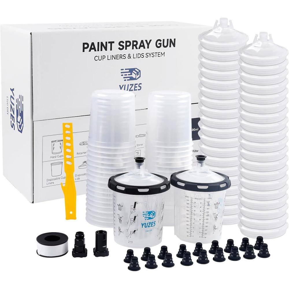 Mix, Spray, and Store-All In One: The YUZES disposable paint cups for spray gun streamlines mixing, spraying, refilling, and storing. Featuring measuring lines for easy mixing directly in the cup. No cleaning needed – just replace the liner. Seal unused paint with the cup plug for future use. Save on paint, cleaning solvents, labor, and time costs with this convenient system.
